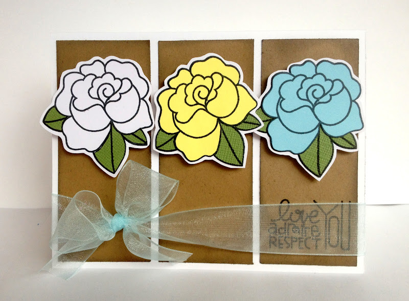 I paper pieced each of the roses (the yellow is my favorite !!) and popped them up from the kraft layers. I stamped the "love, admire, respect you" sentiment beneath the sheer ribbon. I really like how that looks!
